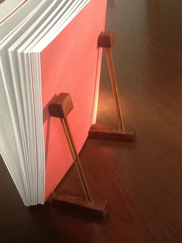 なお、スマフォ用かタブレットPC用かは大きさの違いだけで、基本構造は同じです。 ただ立てておくだけなら大きいほうの部材だけで良いんですが、左右に傾いちゃうと嫌だったので高さをそろえるために小さい方の部材をつけてます。そして、ばらばらになっちゃうのを防ぐために棒で繋ぎとめてます。そんな理由でこんな非対称な形に……。 ちなみに、小さい方の部材は、大きいほうの部材の後部から切り出して作ってます。