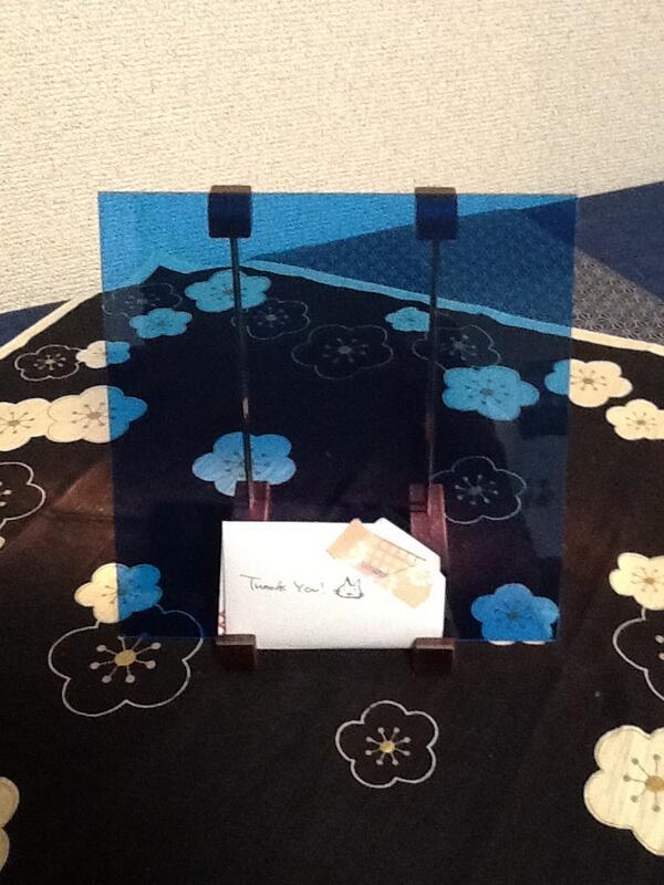 同人誌とかの展示用に作った作品。写真の1枚目は本体のみで、2枚目は本を立てたとき(の裏面側)、3枚目はペーパー表示用にアクリル板をつけた場合です。 このサイズでA4、A5、B5サイズの本を何冊か立てて表示できます。3cmぐらいの溝があるので、薄い本ならそれなりの冊数が立てられます。 紙一枚とかだとへんにょりしてしまって上手く立てて置けないのですが、3枚目の写真のように厚紙とかを使えば問題なく使えます。