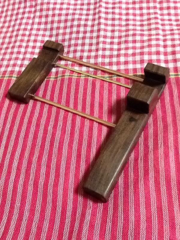 写真2枚目は、上部のワイヤ取り出し部分の拡大画像です。小さい木のブロックの中に、上部中心で交わるように斜めに穴を空けるのが、なかなかに大変な加工でした。