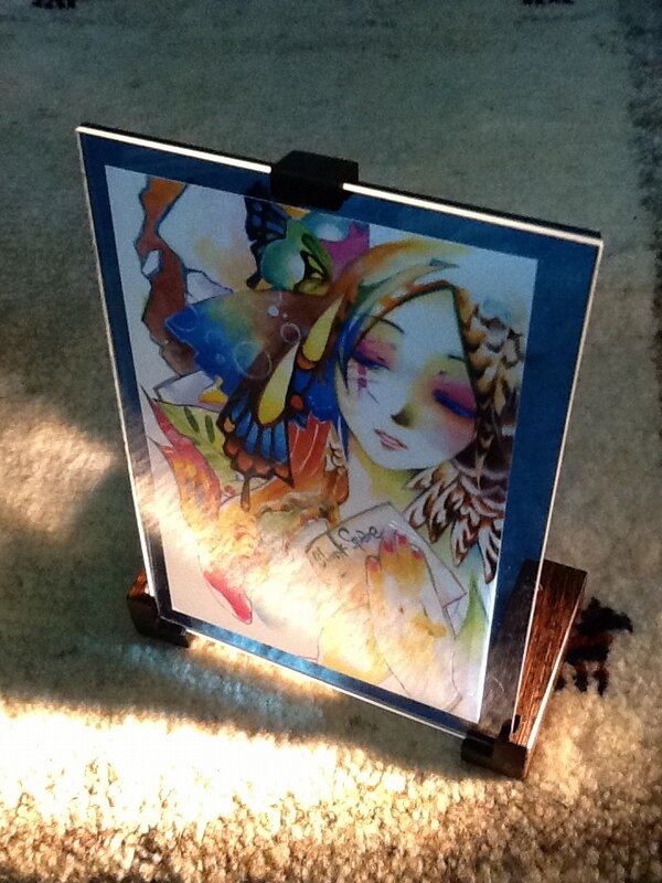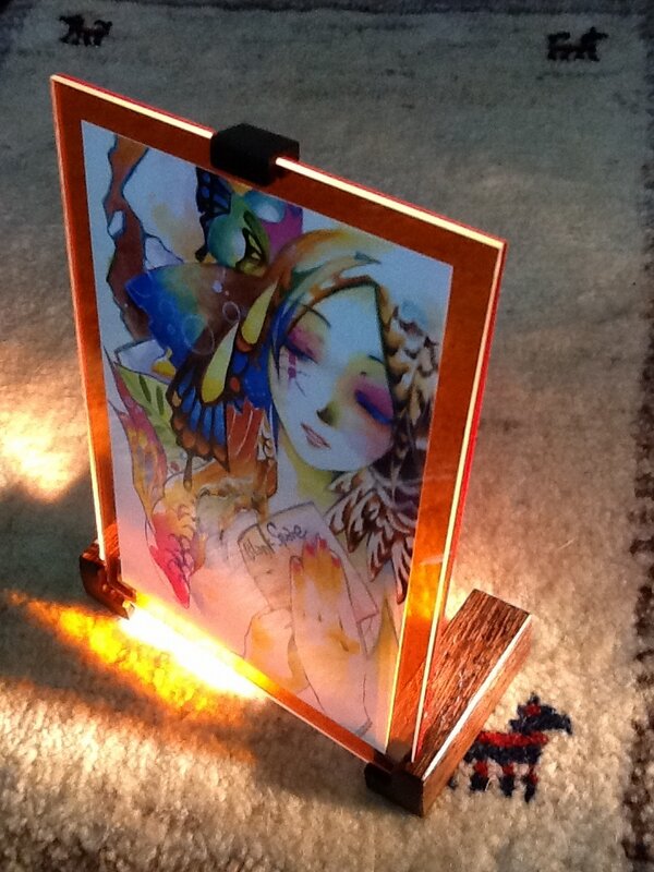 今野隼史さんと神無宇宙さんが開催されたイラスト原画展(Side:KONNO Takashi、Side:KANNA Sora)に納品させて頂いた作品。吊り下げ用のワイヤが色付透明アクリル板の後ろとかに見えないようにするために、木のブロックの中にワイヤを通して上部からワイヤ終端を取り出してます。 そして形を整えるために銅棒や真鍮棒で木のブロックを繋いでます。そんな構造なので、分解するとアクリル板2枚の他は、片手で握れるぐらいに小さくなっちゃいます。